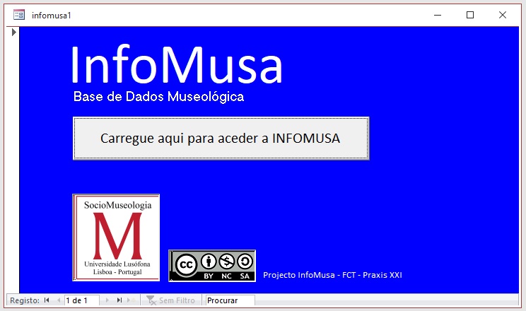 A base de dados InfoMusa foi construída no programa Access, (*.accdb) o qual se encontra no pacote Microsoft Office tal como os programas correntes Word, PowerPoint ou Excel. InfoMusa pode, pois, ser aberta em qualquer computador que tenha instalado o Microsoft Office não necessitando qualquer configuração.